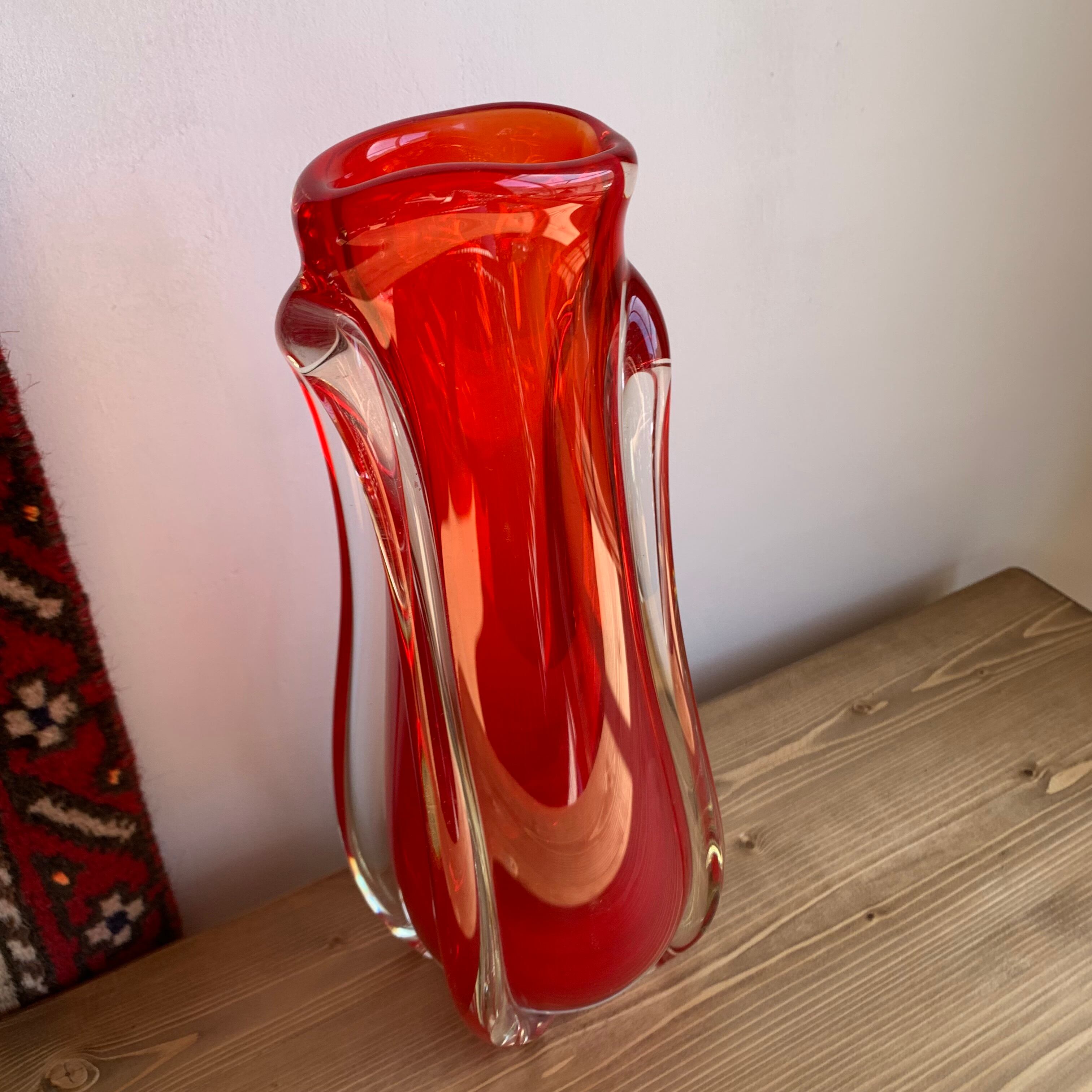 鮮やかな赤とデザイン製の高いシルエットが美しいガラス花瓶です。
